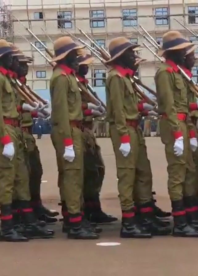 A large group of soldiers dressed in khaki uniforms, red belts, black boots, white gloves, and wide-brimmed hats march in formation across a paved area. They carry rifles with bayonets fixed on their shoulders. In the background are buildings under construction and other personnel. The soldiers move in unison, their steps and rifle positions coordinated. The day appears overcast.