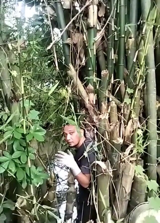 A man wearing a dark shirt, dark pants, and white gloves peeks out from behind a large bamboo stand. The camera then tilts upwards and focuses on the bamboo, which is mostly green and brown in color, reaching towards the sky.