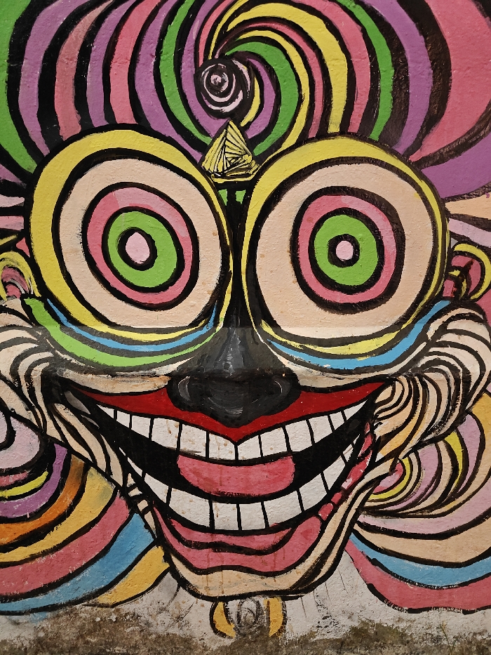 - "A vibrant, stylized mural depicting a grinning face is observed on a textured wall in Kochi, India" by FM-sfCCG2, licensed under CC BY 4.0