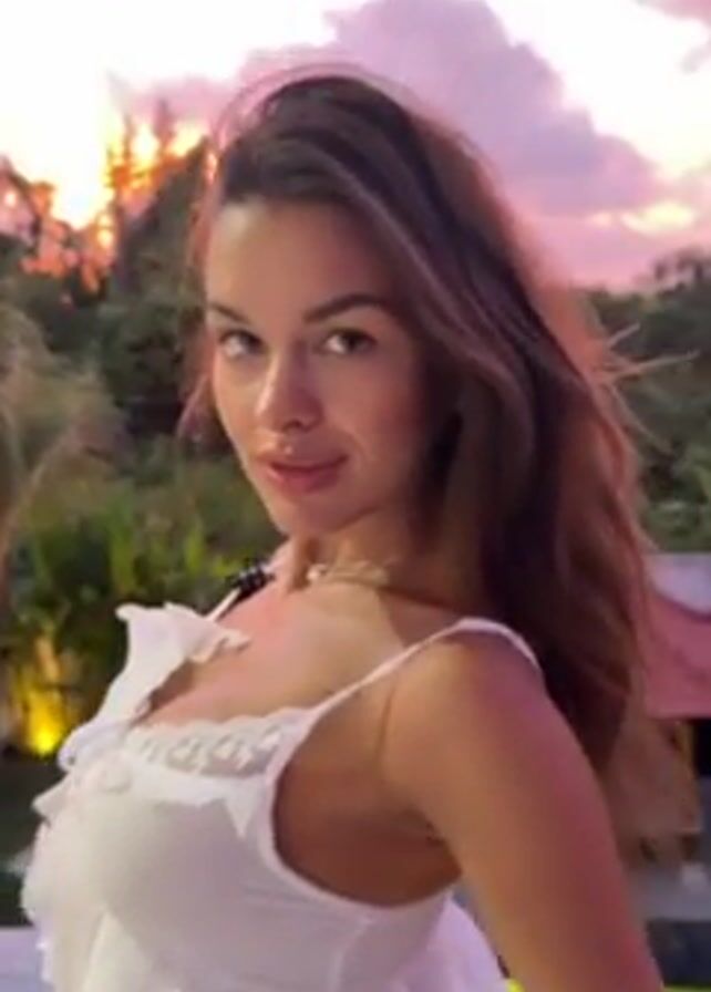 A young woman with brown hair and light skin is posing for the camera. She is wearing a white ruffled top with spaghetti straps and denim shorts. She is outside with a tropical environment of trees behind her. A colorful sky of pinks and purples is visible at sunset. She puts her hand in her hair and looks up at the sky.