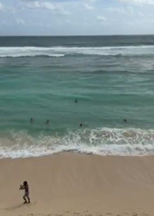 The scene depicts a beach with turquoise water and white-sand. Several people are in the water, presumably swimming or wading. A person is walking along the shoreline. The sky is visible, partially cloudy, with a hint of blue. Footprints are visible in the sand. The sea extends to the horizon where it meets a darker, more distant band of water.