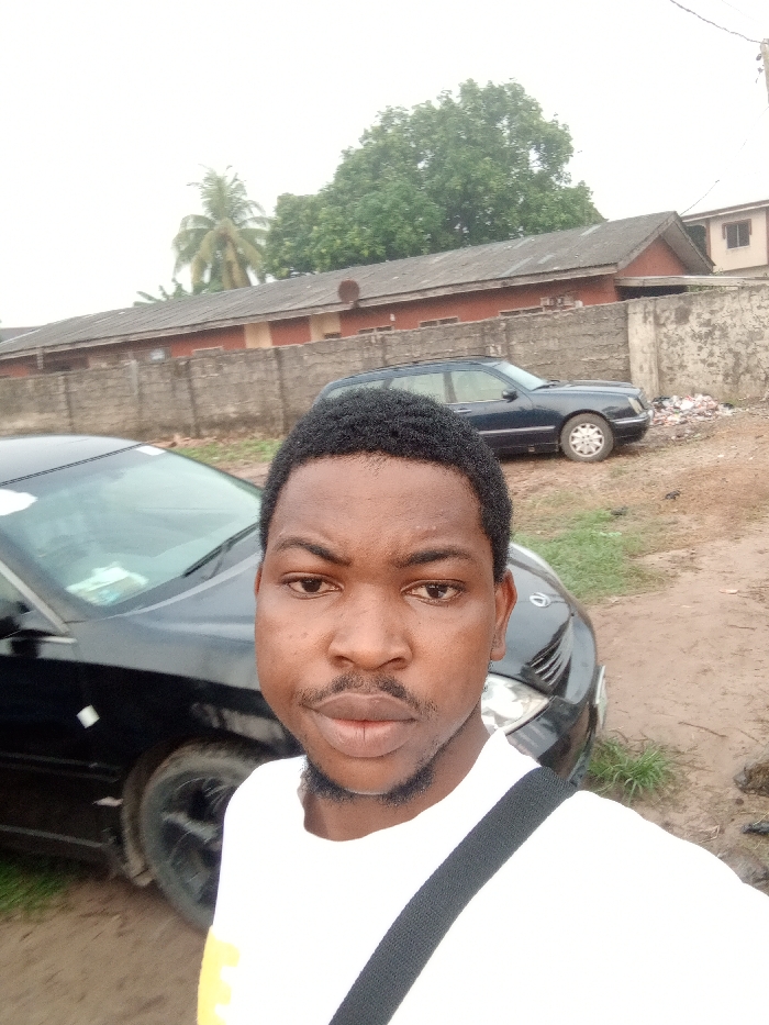 A man takes a selfie outdoors. He wears a white t-shirt with a black strap across his shoulder. To his left is a black car. Behind him, a low concrete wall fronts a long, low building with a dark roof. Beyond that, trees and a hint of a palm tree are visible. Another black car is parked near the wall. The ground appears to be dirt and there's some trash nearby. The sky is overcast.