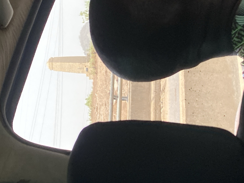 Captured from within a vehicle, the image features a tall, light-brown, brick-like tower visible through the window. The tower is situated on a dry, hilly landscape with some vegetation. An electric line runs through the sky. In the foreground, parts of the car interior are prominent, including the window frame and dark-colored seat headrests, partially obscuring the view. A fence is also visible on the side.