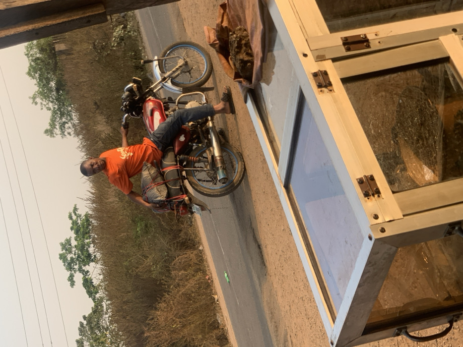 The image portrays an outdoor scene in Kabba, Nigeria. A male individual, appearing to be in his twenties or thirties, is seated on a stationary red and silver motorcycle equipped with blue wheel rims. He is dressed in an orange t-shirt with a white graphic, dark blue jeans, and black slide sandals. The man is positioned leaning slightly to his left, looking directly at the camera with a neutral expression. His left hand rests on the motorcycle's handlebar, while his right arm is extended behind him. A large, dark-colored bundle, secured by red ropes, is strapped to the rear rack of the motorcycle. The motorcycle is parked on a dirt shoulder bordering an asphalt road, which displays a faint white dashed line. A small green plastic item is visible on the asphalt surface. In the lower right foreground, a metal-framed glass display case is angled towards the viewer. The case features aluminum frames, glass panels, and visible hinges and latches. Inside, dark, leafy material is discernable. On the top surface of the display case, a piece of brown fabric holds a clumpy, dark-brown substance. The background features dense, dry brown vegetation and scattered green trees beneath a hazy sky. Utility lines are faintly visible overhead.