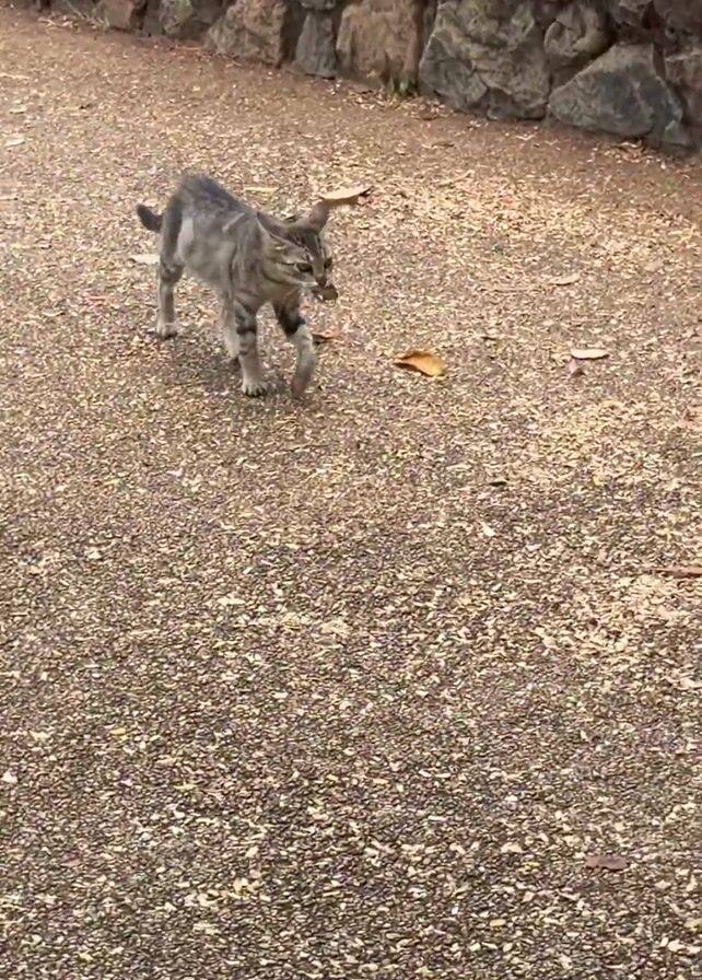 A gray tabby cat walks on a gravel path