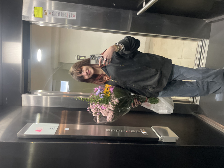 A young woman poses in an elevator, holding a bouquet of colorful flowers. She wears a dark jacket and jeans, adorned with multiple rings and bracelets. She's taking a selfie with her phone, using the elevator's mirror. The elevator features stainless steel panels and buttons. The scene is illuminated by overhead lighting, reflecting off the shiny surfaces.