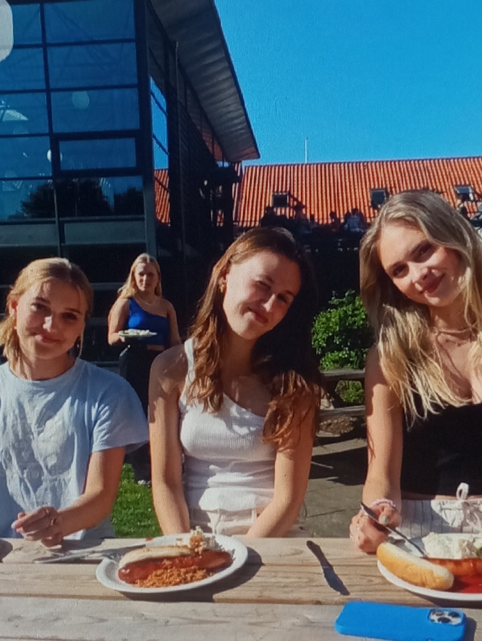 The image depicts an outdoor daytime scene in Łąkoszyce, Poland, featuring four young women gathered around food under a clear blue sky. In the foreground, three young women are seated at a light-colored wooden table. From left to right: 1. A woman with light blonde hair, wearing a light blue t-shirt, is positioned at the left. She smiles faintly and looks towards the camera, with her hands resting on the table. 2. A woman with long, wavy brown hair, wearing a white tank top, is seated centrally. She offers a slight smile, looking at the camera with her head tilted. Her arms are on the table. In front of her is a white oval plate containing a large sausage topped with a red, granular substance (possibly chili or beans) and a dollop of white sauce. 3. A woman with long, straight blonde hair, wearing a black top, is at the right. She smiles towards the camera, holding a fork in her right hand poised over a white oval plate. The plate holds a sausage in a bun, topped with white sauce. A blue smartphone in a protective case lies on the table in the lower right corner. In the mid-ground, slightly to the left of center, a fourth young woman with blonde hair, wearing a blue one-shoulder top, stands holding a white plate. She is looking towards the left, away from the camera. The background features two distinct buildings and green foliage. To the left, a modern building with large, reflective blue glass windows and a dark frame is visible. To the right, an older structure with a distinctive orange/red corrugated or tiled roof stands against the bright blue sky. Green trees and bushes are scattered between the subjects and the background buildings, indicating an outdoor dining or social area. The overall scene suggests a casual gathering or meal on a sunny day.
