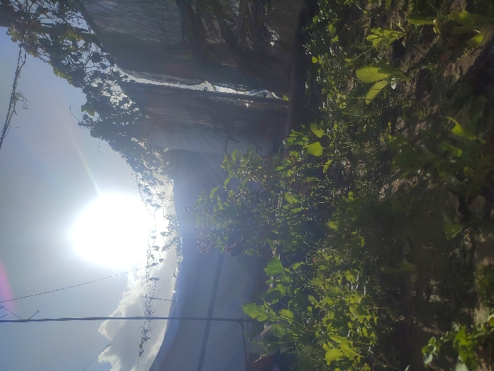 The image depicts an outdoor agricultural plot or garden in Khan Yunis, Palestinian Territory. The foreground features dry, brown soil populated with numerous small, green, broad-leafed plants, appearing to be young crops or seedlings, illuminated from the upper left. These plants cast shadows towards the viewer. In the midground, a cluster of taller, denser green vegetation is visible. The background on the left consists of a structure covered with light-colored, possibly white or translucent, plastic sheeting or tarpaulin, with thin support wires or strings spanning overhead. To the right, a darker, vertical structure, resembling a wall or fence, is largely covered by dense green vines, possibly grapevines, that extend across the upper portion and hang downwards. The sun, a prominent and overexposed orb, is situated in the upper-center, generating significant lens flare and bright illumination. The sky is clear blue with scattered white clouds visible in the upper left quadrant. No individuals are present in the scene.