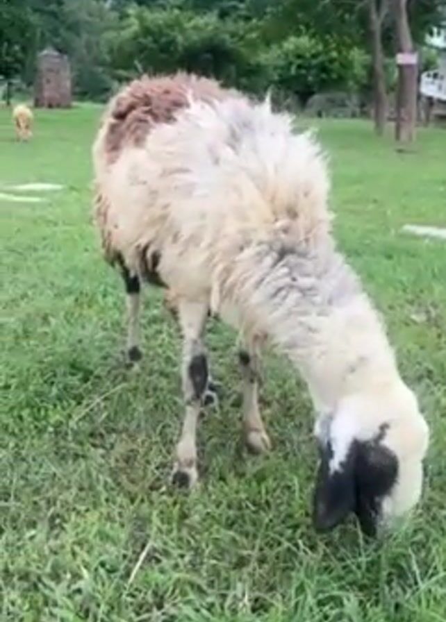 small flock of sheep grazing in a green grassy field. The sheep are mostly white with some brown and black markings. One sheep is closer to the camera, focusing on it eating the grass. In the background, other sheep are seen grazing, and a person in a pink shirt is attending to them. The surrounding environment includes trees and a structure in the distance.