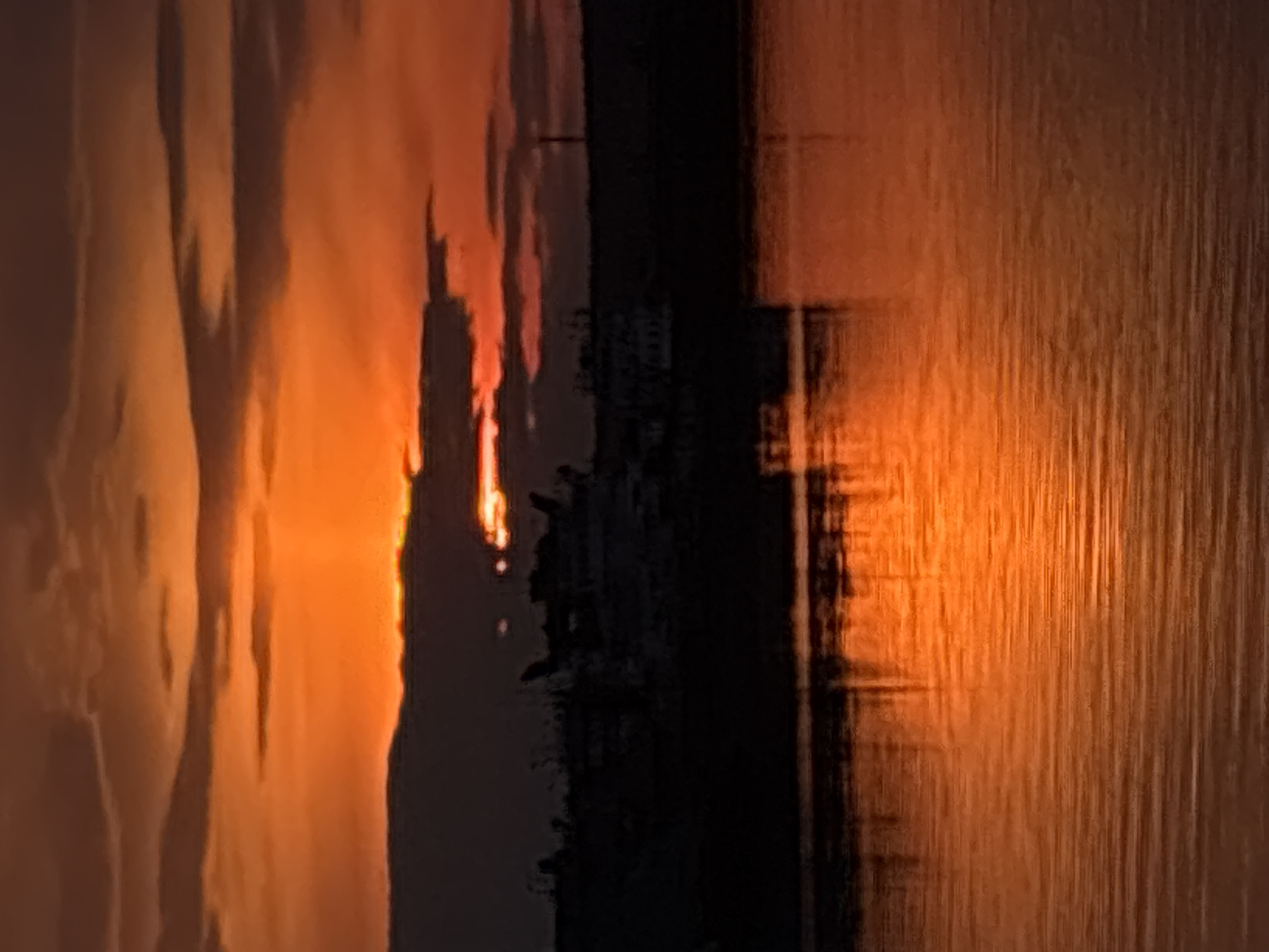 The image depicts a sunset over water in what appears to be Chaikovsky, Russia. Silhouetted against the orange and red sky are distant buildings or structures on the horizon. The water reflects the colors of the sunset, creating vertical patterns. No people are visible. The overall scene is tranquil and picturesque.