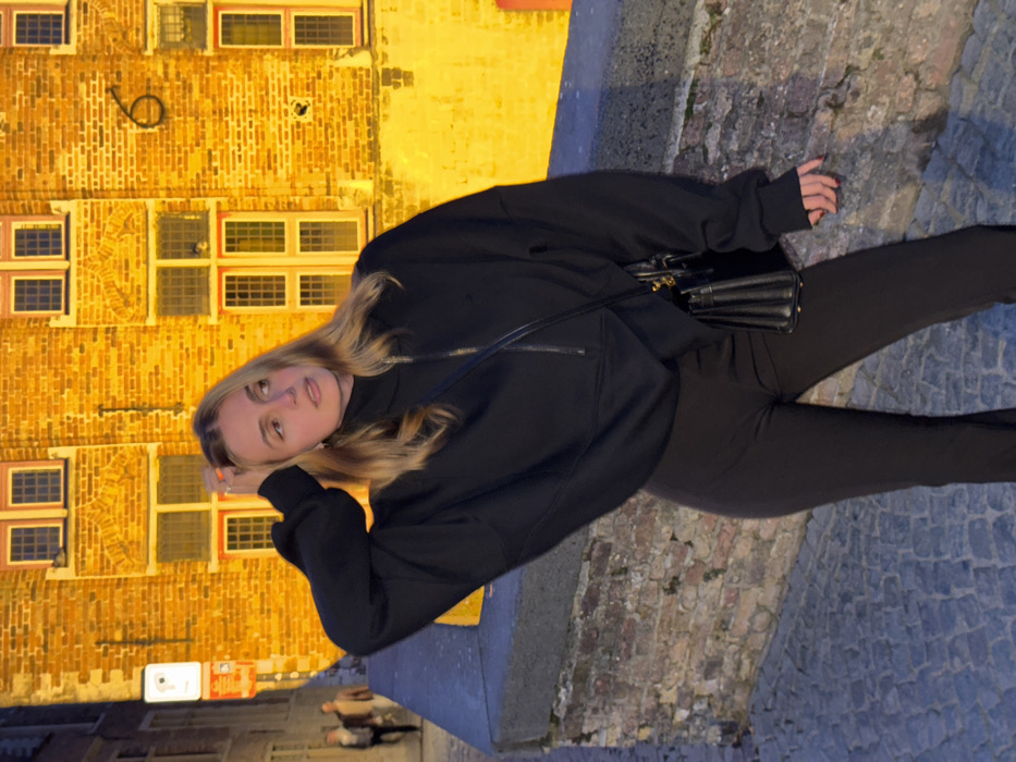 The image captures a young adult female on a cobblestone surface adjacent to a stone parapet in the city of Bruges, Belgium, during nighttime or dusk. The female, appearing to be in her late teens to mid-twenties, has long, light blonde hair and fair skin. She is dressed in a black, oversized, long-sleeved turtleneck or quarter-zip top and dark-colored, form-fitting pants. A small, black, structured shoulder bag with a top handle is worn across her body, resting on her right hip. Her right hand is positioned on the right side of her head, fingers touching her hair. Her left hand is not fully visible. Her gaze is directed towards the viewer's left, exhibiting a neutral expression. Her fingernails are painted red. In the background, a multi-story historic building, constructed of light-colored brick and indicative of Flemish architecture, is prominently illuminated with warm yellow artificial light. This building features multiple rectangular windows with white frames. A distinct numeral '6' is attached to the upper right section of its facade. To the far left of the background building, a vertical white sign with a rounded top edge is visible. The immediate foreground consists of a dark grey cobblestone pathway and a stone parapet or railing composed of reddish-brown bricks topped with a darker grey coping, upon which the subject stands. In the distant left background, two blurred human figures are discernible, walking on what appears to be another section of the street or path.