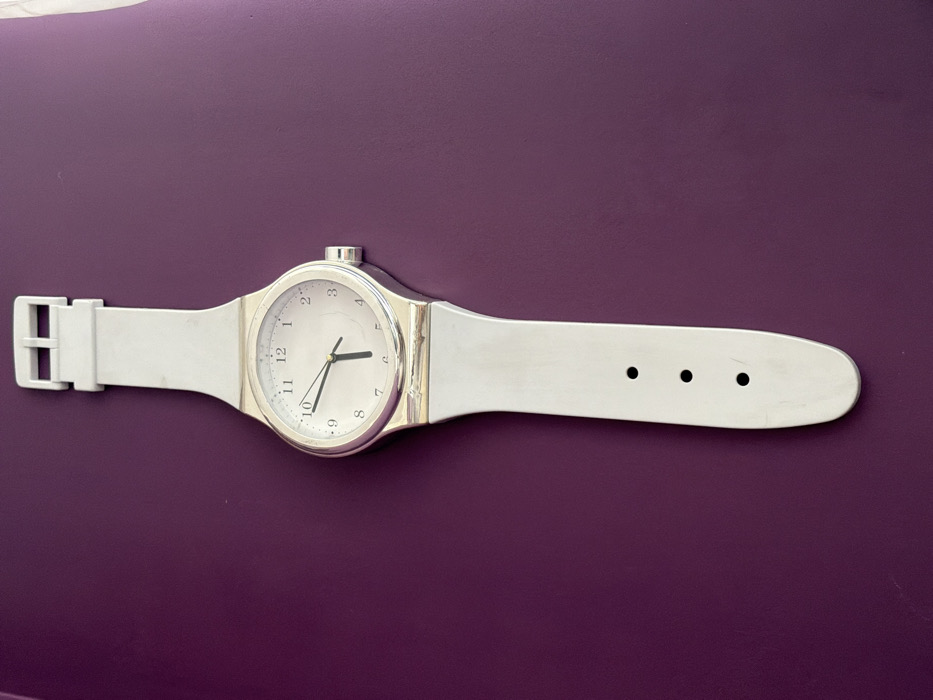 In Sofia, Bulgaria, a large wall clock designed in the style of a wristwatch is presented vertically against a uniform, solid purple background. The clock features a prominent circular, silver-toned metal casing that encases a white dial with black numerical hour markers from 1 to 12. Two black hands, an hour hand and a minute hand, are visible, indicating a time of approximately 10:07. A silver-toned crown protrudes from the right side of the casing. Attached to the top and bottom of the casing is a wide, white strap, likely made of silicone or plastic, mimicking a watch band. The upper segment of the strap terminates with a silver-toned buckle, while the lower segment displays three distinct, circular adjustment holes. The object is stationary, and no individuals, actions, or interactions are depicted in the scene.