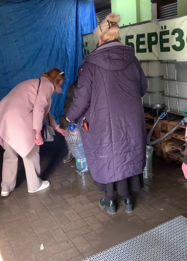 In an indoor shot, three individuals gather around a filling station inside a covered structure with a wood-beamed ceiling. A woman in a pink coat and beige pants, wearing white sneakers, leans over to fill a clear plastic jug with water. Standing to her right is another woman in a dark purple puffer coat, a black skirt, and green dress shoes, who is also filling a jug. Behind them, a man in dark clothing and tall black boots tends to the equipment. A blue tarp hangs in the background to the left, while a green and white banner with Cyrillic lettering is visible to the right. The floor is tiled in brown brick-like patterns, with a gray mat in the foreground. Multiple metal tanks are stacked on wooden pallets in the background. The overall lighting is a mix of natural light and artificial lighting from overhead fluorescent fixtures.