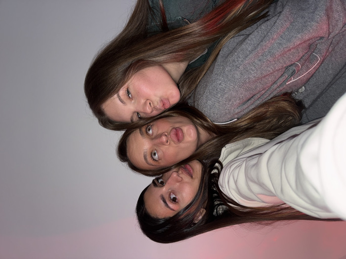 Three young women pose closely for a selfie, their faces arranged one above the other