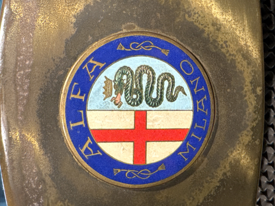 - "A close-up, top-down view captures a circular Alfa Romeo emblem, affixed to a weathered, textured metallic surface exhibiting a dark bronze or brass patina with areas of subtle reflection" by FM-SHEMl1, licensed under CC BY 4.0