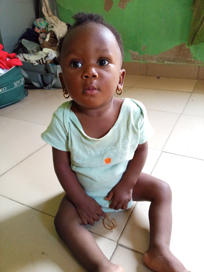 The scene is set indoors, in a room located in Zango-ndaji, Nigeria. A young child, appearing to be an infant or toddler, with dark skin, short dark hair, and dark eyes, is seated directly on a light-colored tiled floor with dark grout lines. The child wears a light green short-sleeved bodysuit, featuring the embroidered text "home grown" and a small orange graphic on the chest. Small gold hoop earrings are present in both earlobes. The child's body is angled slightly, with the head facing directly forward, eyes open, looking towards the viewer. A single brown rubber band lies on the floor near the child's left hand. The background consists of a wall painted a vibrant green, exhibiting areas of chipped and peeling paint. To the left of the child, a pile of assorted clothing, including a prominent red item, rests on or against a partially visible green and grey bag with white text.