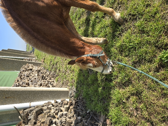 - "An outdoor scene in Estaimpuis, Belgium, features a brown horse with a white facial blaze, actively grazing on green grass, its head lowered" by FM-dTRWD3, licensed under CC BY 4.0