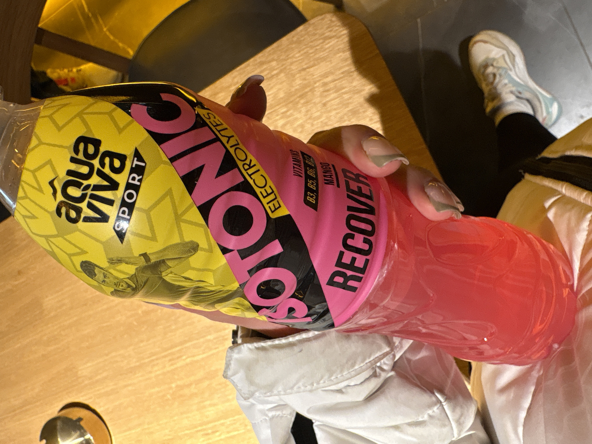 - "person holding a bottle of Aqua Viva Sotonic Sport drink, specifically the "Recover" variant with a mango flavor" by FM-sZqdx1, licensed under CC BY 4.0