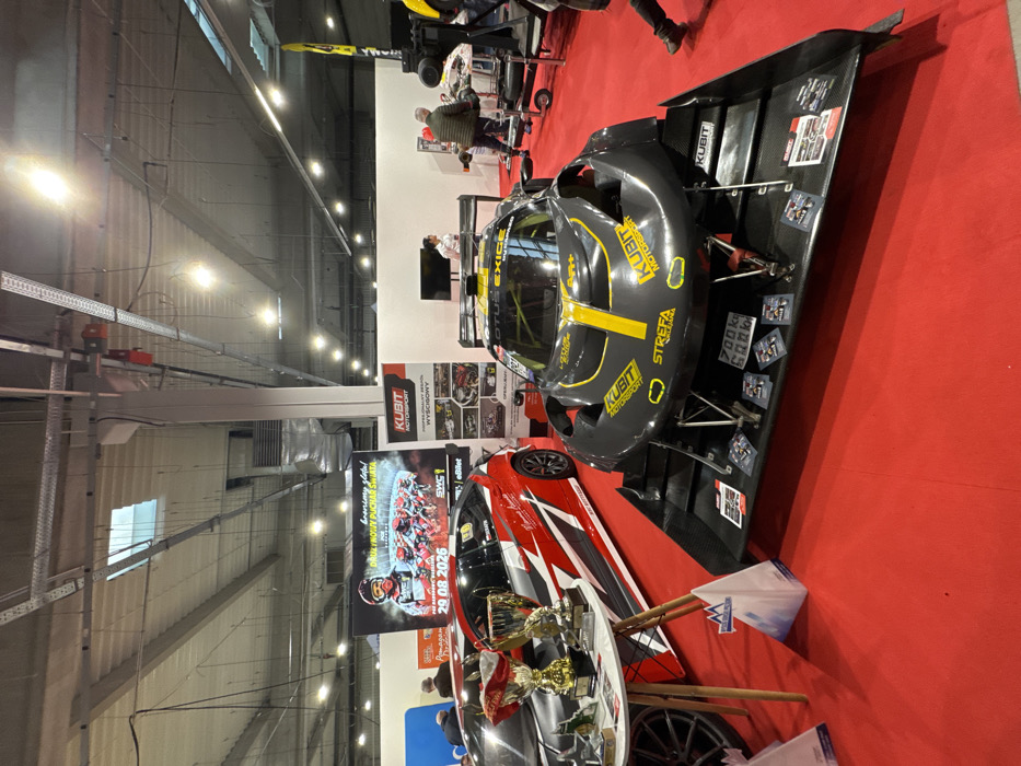 The scene depicts an indoor exhibition within a large hall, located in Wolica, Poland. The floor is covered entirely with a red carpet. The ceiling is high, featuring exposed metal trusses, industrial lighting fixtures, and ventilation ducts. In the mid-ground, two distinct race cars are on display. To the left, a red and black hatchback-style race car is presented, featuring abstract white and grey graphics and "KUBIT MOTORSPORT" branding. Adjacent to this car, a small, round white table with light wooden legs holds several golden trophies and various smaller awards. To the right, a dark grey/black open-wheel or highly modified sports car, identified with "KUBIT MOTORSPORT" and "LOTUS EXIGE" branding in yellow lettering, is positioned with a prominent front aerodynamic package, including a large diffuser-wing assembly. Several small informational cards are placed on this front diffuser. In the background, a large banner features an image of a motorcyclist and text including "DRUŻYNOWY PUCHAR ŚWIATA" (Team World Cup) and the date "29.08.2026." Next to it, a "KUBIT MOTORSPORT" stand displays "PROFESJONALNY SPRZĘT WYŚCIGOWY" (Professional Racing Equipment) and images of automotive parts. Several individuals are present, observing the exhibits. One person in a white shirt stands behind the dark grey race car, near a black display screen. Other people are visible moving or standing in the background. The overall environment suggests a motorsport or automotive trade show.