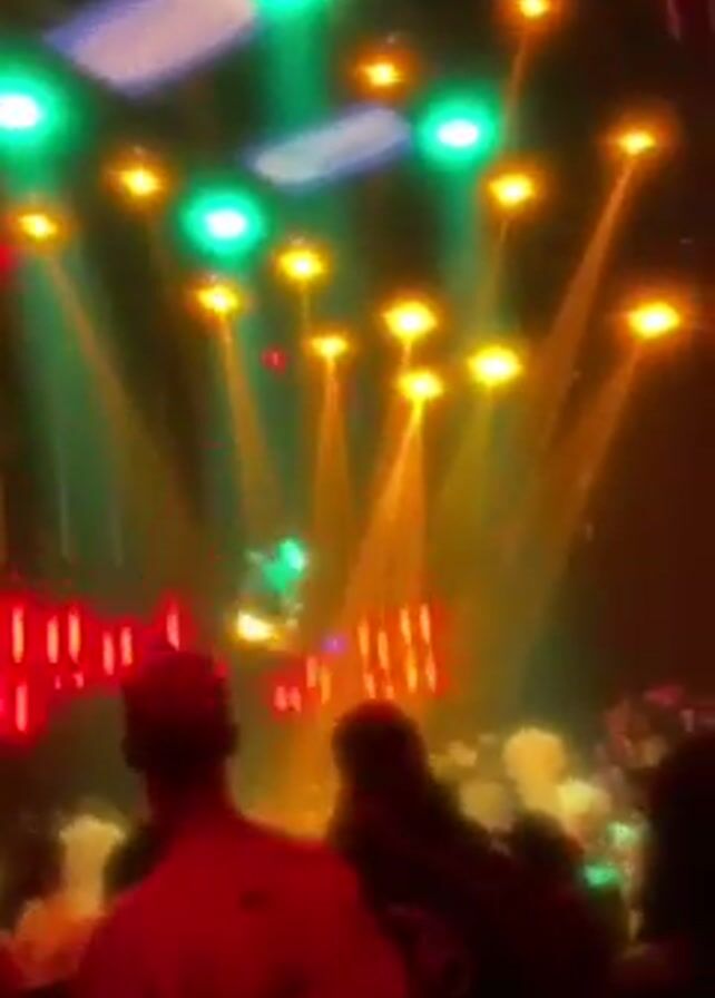 crowded nightclub environment. The camera is at a low angle, looking up at a stage with multiple lights: predominantly red vertical light bars, several green, yellow, and blue spotlights illuminating the space. There is a person on the stage moving upwards on a rope mechanism. The audience below is blurred, but several people can be seen standing and seemingly watching the stage performance. The overall lighting creates a vibrant and energetic atmosphere typical of nightclubs and performances.