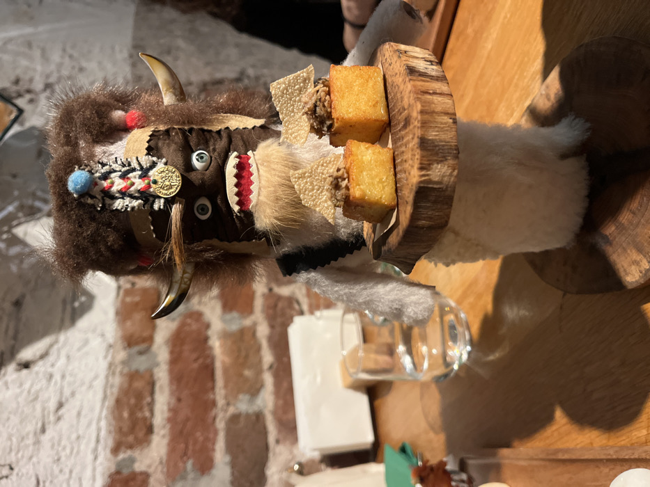 A detailed image captured in the Cosmos restaurant in Sofia, Bulgaria, displays a stylized Kuker doll serving food on a wooden table
