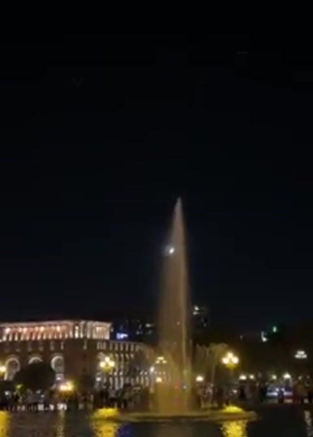 fountain at night with the moon visible above it. The fountain shoots water up into the air, illuminated by colored lights, and the lights reflect on the water. A large building is visible in the background, lit up with yellow lights. People are standing around the fountain, watching the display. The sky is dark, and there are a few stars visible. As the video progresses, more of the fountain comes into view, showing a wider array of colored lights.