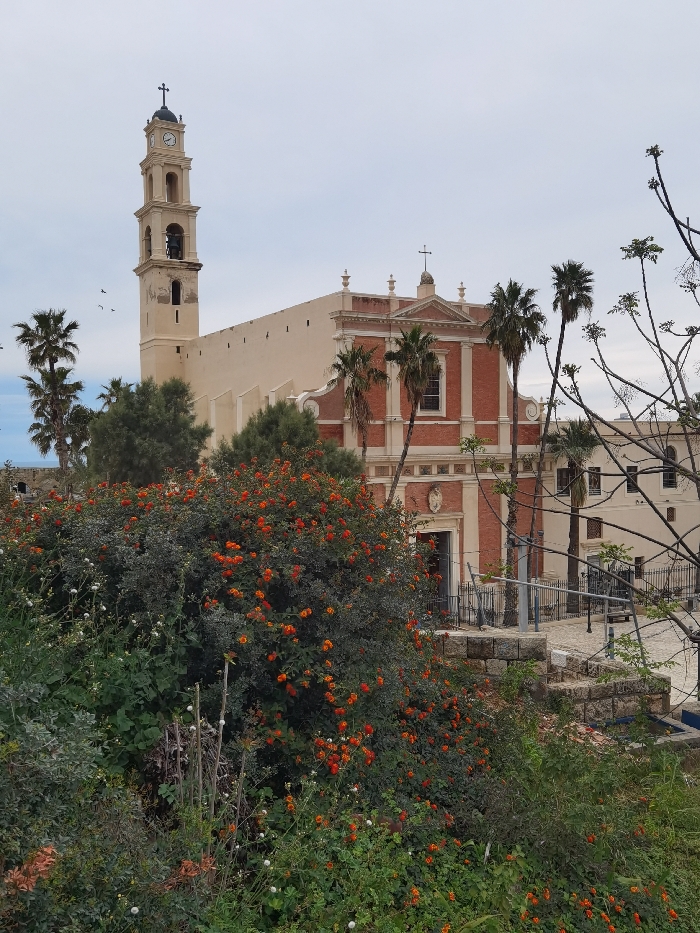 The image presents an exterior view of St. Peter's Church in Old Jaffa, Tel-Aviv, Israel. The church, a Baroque-style structure, features a prominent, slender, light beige bell tower (campanile) on the left, equipped with a visible clock face and arch-shaped openings for bells, topped by a cross. The main facade of the church, to the right of the tower, is predominantly reddish-orange with lighter stone or plaster detailing, including columns, cornices, a central pediment, and a large window above the main entrance. Another cross is affixed to the apex of the facade. The primary body of the church behind the facade is a lighter beige tone. Several tall palm trees are strategically positioned around the church, with some appearing in front of the facade and others near the bell tower and in the distant background. The sky overhead is overcast and light grey, with a faint blue hint of the Mediterranean Sea visible in the far-left background beyond the palm trees. Small, dark bird-like shapes are scattered in the sky near the bell tower. The foreground is densely covered with vegetation, including a large, vibrant bush heavily adorned with small, bright orange flowers, likely a species of Lantana. Other green plants, some with white spherical seed pods or flowers, and dried stalks are interspersed throughout the lower and mid-left areas. In the lower right quadrant, remnants of stone block structures, possibly old walls or steps, are partially visible beneath the foliage, leading to a paved area with black metal railings adjacent to the church entrance. No individuals are depicted in the scene.