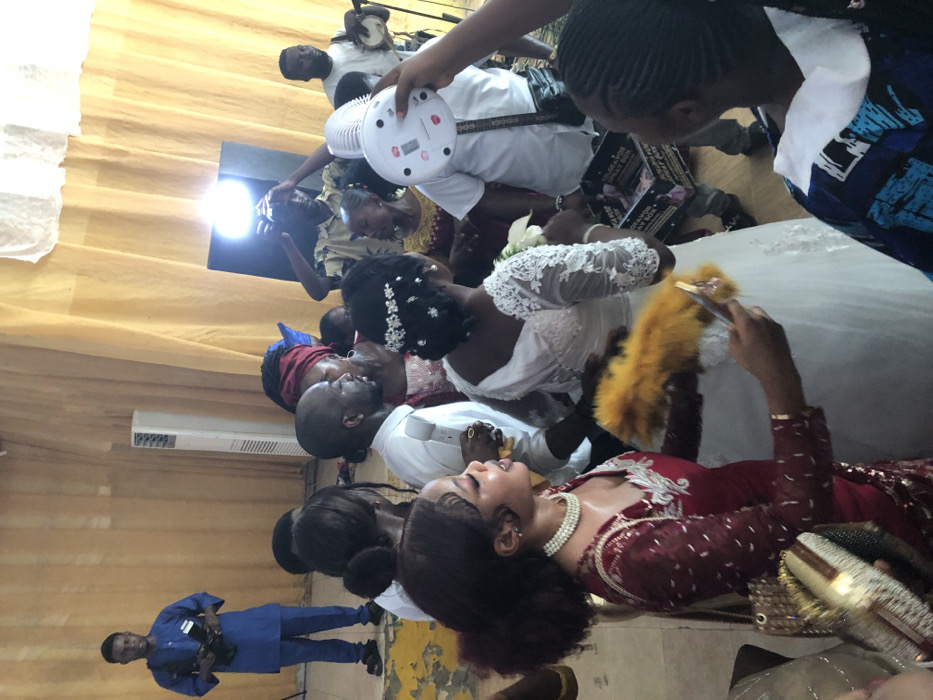 The scene depicts an indoor event in Lokoja, Nigeria, characterized by a celebratory gathering