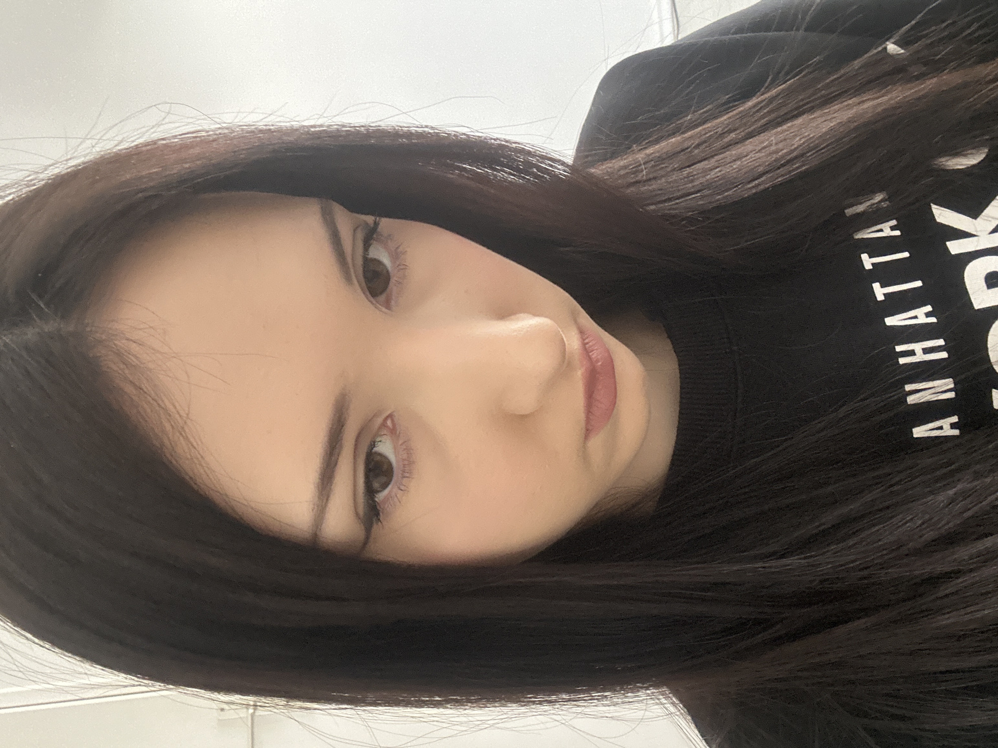 A close-up, head-and-shoulders portrait depicts a young female located in Cachan, France. The subject has long, dark brown hair parted slightly off-center, cascading over her shoulders and chest. Her skin tone is light. She wears a black crew-neck sweatshirt with white text partially visible on the chest, appearing to read "MANHATTAN WORK." Her dark brown eyes are cast downwards and slightly to the viewer's right, with noticeable eyeliner on the upper lash line. Her lips are closed and slightly downturned. The background is a plain, light-colored surface, possibly a wall, with a faint vertical line visible on the left side, indicating an indoor setting. The lighting is soft and even.