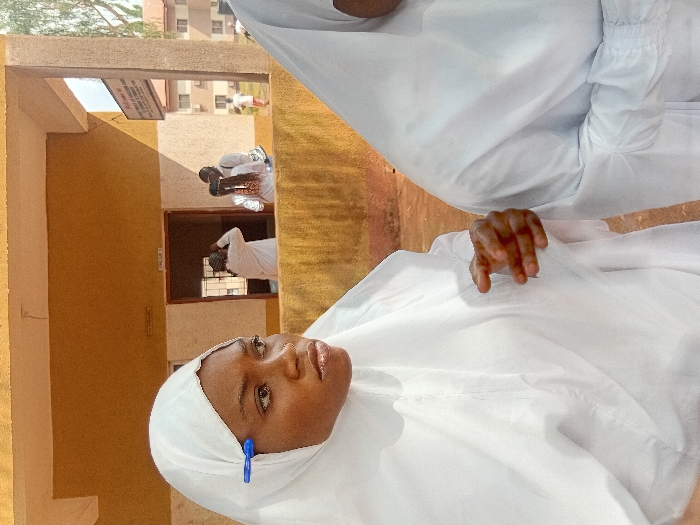 A young woman wearing a white hijab looks up. She has a blue clip on her hijab. Another person in white stands above and slightly behind her. Further in the background, people are seen walking near a building with yellow walls and a dark doorway.