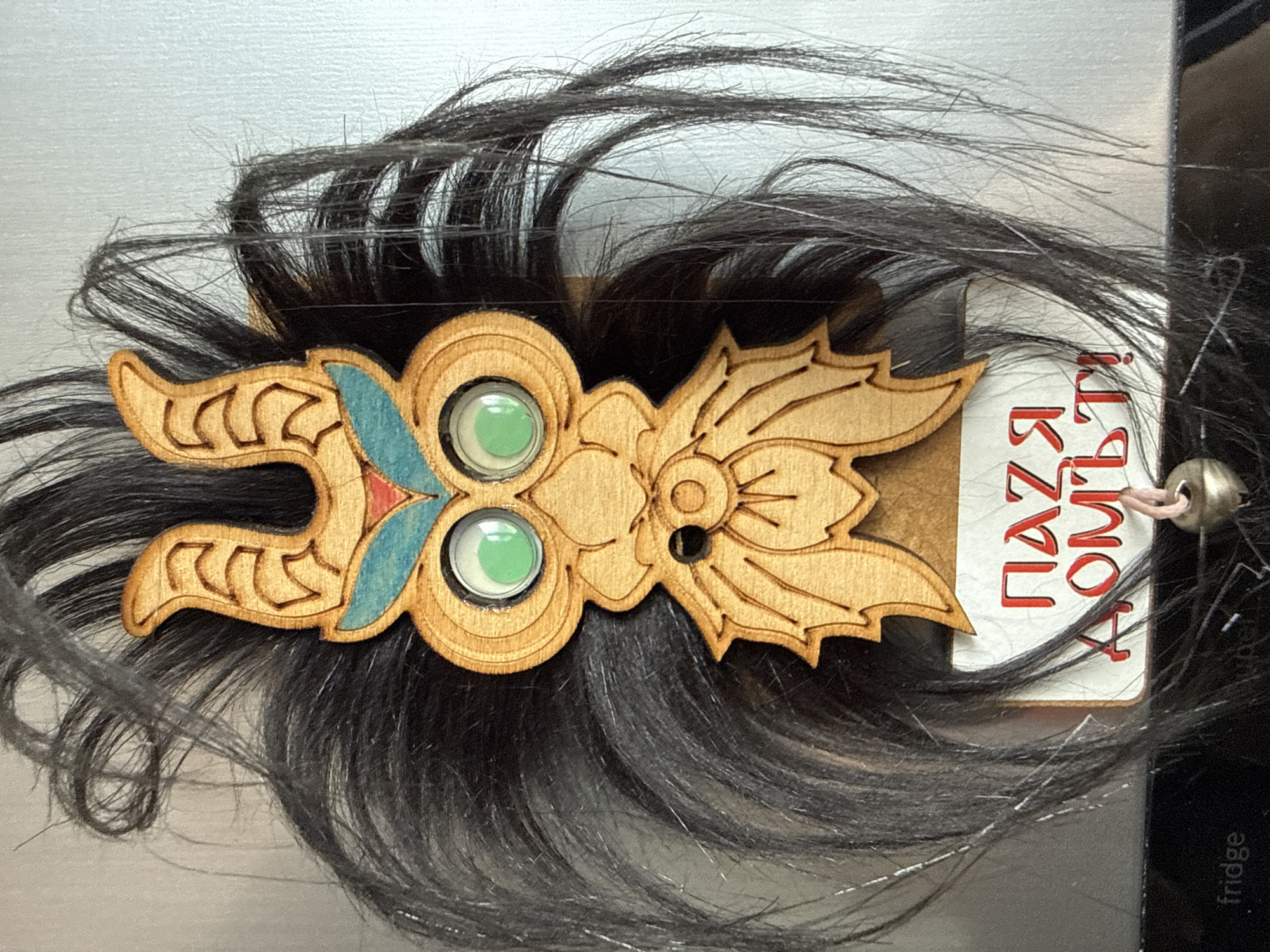 A wooden hair accessory featuring an owl design with green plastic eyes and blue/red painted details is surrounded by a tuft of black hair