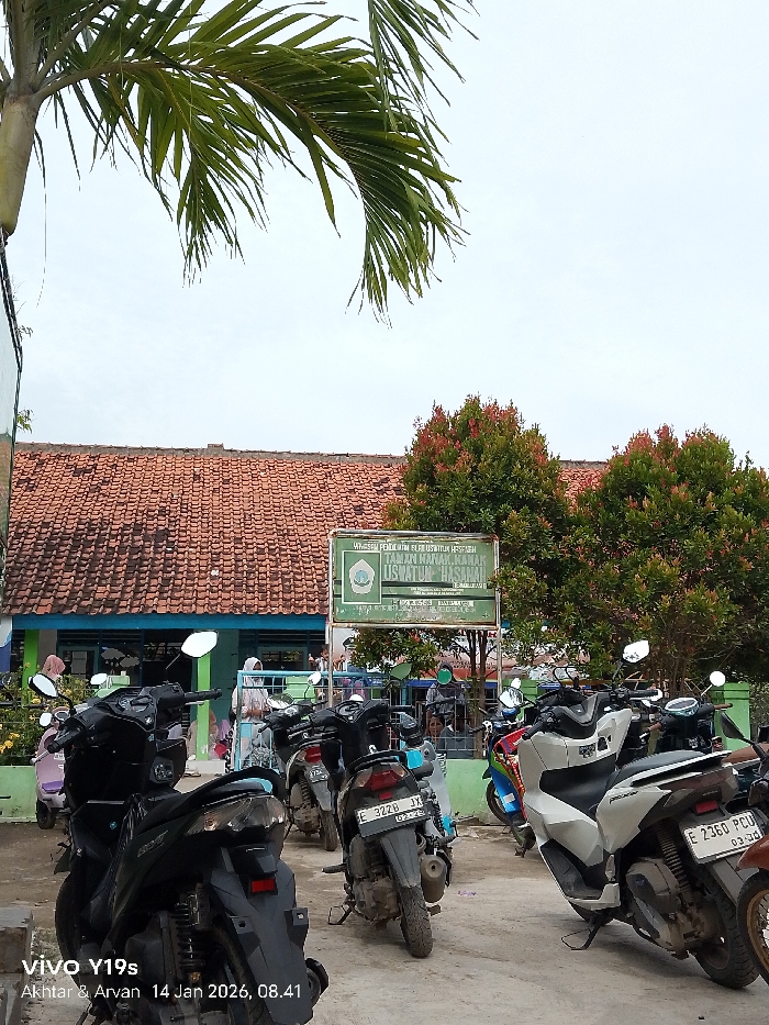 The image depicts a row of parked motorcycles in front of a building with a red tile roof. A sign identifies the building as "Taman Kanak-Kanak Uswatun Hasanah," which translates to "Uswatun Hasanah Kindergarten". Green leafy trees frame the scene. The sky is overcast. The photo was taken on January 14, 2026 at 08:41 with a Vivo Y19s phone by Akhtar & Arvan.