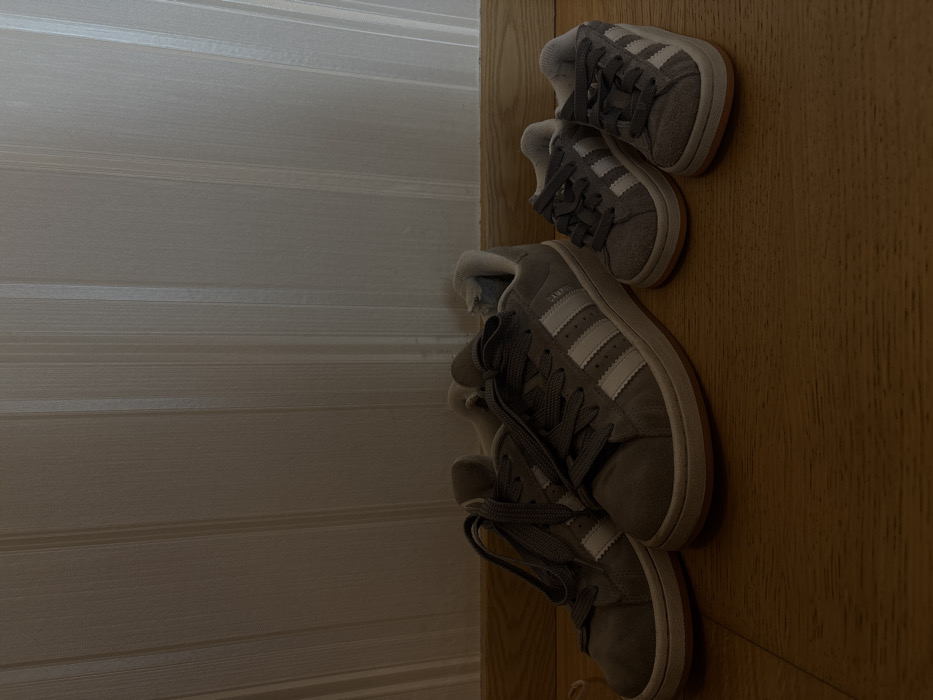 An indoor scene in Bratislava, Slovakia, displays four grey Adidas sneakers on a light brown wooden floor. On the left, two adult-sized Adidas Campus sneakers, each featuring three white stripes and a light brown sole, are positioned. These shoes show moderate signs of wear. To their immediate right, two child-sized Adidas sneakers, matching the adult pair in grey color, white stripe design, and light brown soles, are present, exhibiting minimal wear. The background consists of a light-colored, vertically textured wall or curtain, separated from the floor by a light-colored wooden baseboard. The scene is dimly illuminated. No individuals are present.