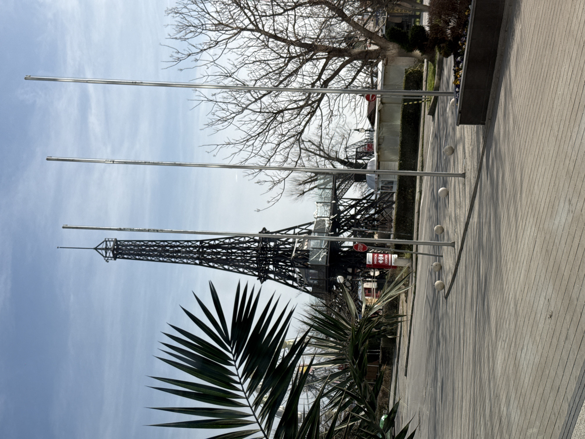 The image depicts an outdoor scene within the Sea Garden (Morska Gradina) of Varna, Bulgaria, under a light blue sky with scattered clouds. A prominent, dark-colored, lattice-structured replica of the Eiffel Tower stands in the mid-ground, featuring multiple accessible platform levels. A red octagonal "STOP" sign and a red and white "MEDICAL CENTER" sign are affixed to a pole near the tower's base. In the immediate foreground on the left, large, dark green palm fronds partially obscure the view. To the right of the palm fronds, three slender, metallic flagpoles rise vertically from a light-colored paved pedestrian area, which is bordered by three spherical bollards. Beyond the bollards, an asphalt path curves to the left. Bare deciduous trees with intricate branch patterns are visible on the right side of the image and in the background. A rectangular planter box in the lower right contains small flowering plants and dry foliage. A large amusement park ride, possibly a Ferris wheel, is partially visible behind the palm fronds on the left side of the tower. No individuals are present in the scene. Natural daylight illuminates the area, casting distinct shadows on the pavement.