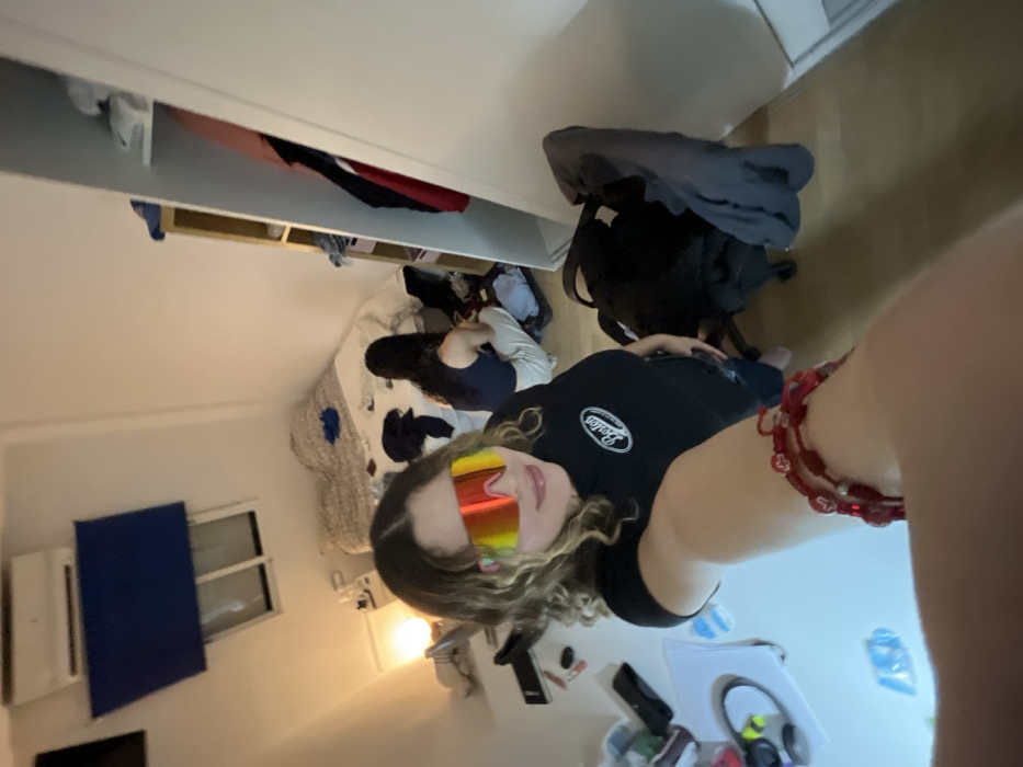 A selfie-style image captured inside a bedroom. A woman wearing colorful sunglasses and a black t-shirt faces the camera, her arm and red bracelets prominent. Behind her, a bed with another person sitting on it is visible. A black backpack and various objects are scattered around the room. A window with a blue curtain and a glimpse into a closet add to the cluttered background. The image is slightly tilted, giving a casual, spontaneous feel.