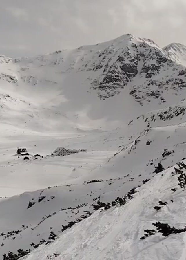 snowy mountain landscape. A few buildings are visible in the valley below. There are tracks in the snow, possibly made by skis or other equipment. The sky is overcast.