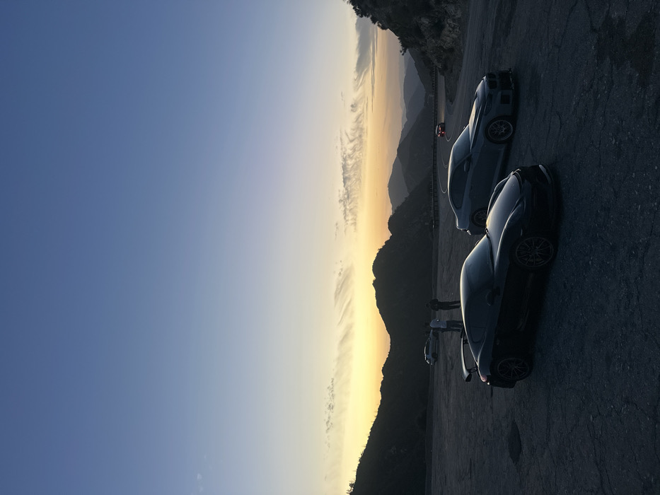 Two sleek, dark-colored sports cars sit parked on an asphalt surface at dusk. Mountains form the backdrop, silhouetted against a fading orange and yellow sky. A few people stand near the cars. In the distance, another car can be seen further up the road. The image shows a scenic overlook with the gathering darkness accentuating the contours of the landscape.