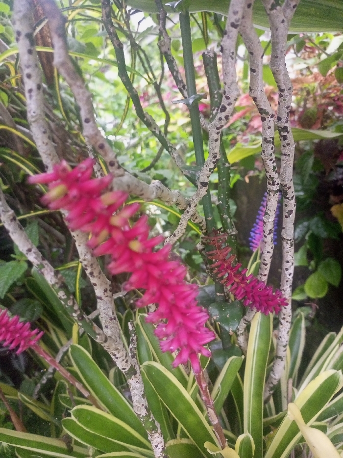 This image depicts a close-up, soft-focus view of diverse flora located in Zee Pin Kone, Myanmar. The immediate foreground features two prominent, elongated inflorescences of vibrant pink flowers, appearing blurred. Below these flowers, variegated leaves with green and yellow stripes are visible, consistent with a bromeliad species. The midground contains multiple slender, light greyish-brown branches or stems characterized by dark, irregular spots, interwoven across the frame. Centrally, a straight green stem with a small, reflective silver-colored clip or tie is present. Further back, partially obscured, is another reddish-pink inflorescence and a distinct blue-purple inflorescence. The background consists of dense green foliage, some exhibiting yellow variegation, suggesting a lush garden or tropical setting. The scene is illuminated by natural light. No individuals, animals, or additional man-made structures are present.