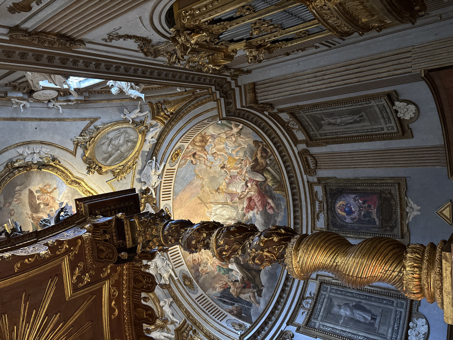 The image depicts the opulent interior of the Cappella del Sacramento (Chapel of the Sacrament) located within the Duomo di San Feliciano (Cathedral of San Feliciano) in Foligno, Italy. The perspective is upward-angled, showcasing the intricate decorations and architecture. In the left foreground, a prominent, spiraling golden column, part of the high altar's balustrade, rises upwards. Its base features twisted fluting, transitioning to relief carvings resembling foliage or vines higher up. Above this column, a dark, elaborately carved wooden structure with gold accents, possibly a canopy or section of a pulpit, is partially visible. The central feature is a large, semi-circular ceiling fresco, likely "The Glory of Saints," depicting numerous figures. On the left, a cross is visible amidst robed figures. In the center, a divine figure is surrounded by a radiant light, with angels and saints ascending and adoring. The fresco is framed by a heavily gilded architrave and cornice featuring white stucco cherubs and intricate relief patterns. Above this, the vaulted ceiling segments include smaller frescoes or grisaille paintings within gilded oval frames, interspersed with additional white stucco figures and gold ornamentation. Below the main fresco, the pale blue-grey walls are adorned with framed artworks. A large, rectangular grisaille-style painting of a standing robed figure is visible on the left wall. Further right, beneath the main fresco, a smaller, colored painting depicting the Madonna and Child with other figures is displayed. Another grisaille-style painting of a robed figure is visible on the right wall. On the far right, a section of a large pipe organ, featuring polished silver pipes set within an extensively gilded wooden structure adorned with scrolling elements, is visible. The entire space is characterized by pervasive gold leaf, detailed frescoes, and white stucco sculptural elements, contributing to an atmosphere of ecclesiastical grandeur. No living individuals are present in the scene.