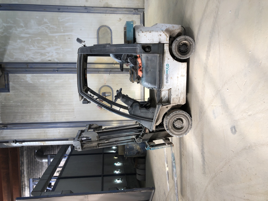 The image depicts an indoor industrial environment within the city of Čeluga, Montenegro. A white and dark grey industrial forklift, bearing the "EUROMIXO" logo, is prominently positioned in the center, oriented towards the left. The forklift is stationary on a concrete floor extensively covered in light-colored dust, showing tire tracks and scuff marks. Its two front forks are extended forward and slightly lowered. The vehicle exhibits significant dust and grime accumulation, indicating active use in a dusty environment. The forklift features a dark grey overhead guard and operator's cabin area. A black seat is visible, with an orange strap or rope resting on it. A teal-colored rectangular container is placed on the right side of the cab. The tires appear robust and are also coated in dust. In the background, the scene reveals more of the facility. To the immediate right of the forklift, a large, light-colored industrial door or wall panel with vertical ridges and two oval-shaped recessed features is visible. A faint, red-colored sign with unreadable white text is affixed to this panel. To the left and rear of the forklift, an open bay leads into another section of the building. This area features a brick wall in the upper left, large dark metal structures that appear to be part of industrial equipment, and several dark industrial barrels on the ground. Multiple small, wall-mounted light fixtures are visible along a lower structure in this background section. A large wooden beam is visible overhead in the far left background. No individuals are present in the scene, and no active operations are depicted.