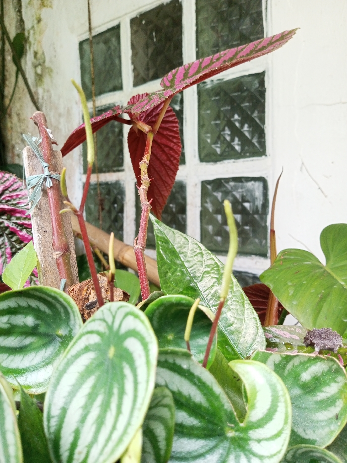 The scene is located in Neerveli, Sri Lanka. The image presents a close-up view of diverse plant foliage set against a building exterior. In the foreground and midground, a cluster of plants is visible, including Watermelon Peperomia (Peperomia argyreia) characterized by round, dark green leaves with radiating silver-white stripes. Several slender, light green flower spikes with reddish stems protrude from the dense foliage. A prominent reddish-burgundy Begonia leaf with pinkish-green patterns is positioned in the upper midground. Other various green leaves are interspersed throughout the composition. A small, grayish-brown anuran, consistent with a toad, is perched on a green leaf in the lower right quarter of the image. A vertical light brown wooden stake, secured with a light blue tie, supports some stems on the left. The background consists of a white wall section and a window featuring multiple square panes of patterned, translucent glass with a white frame.