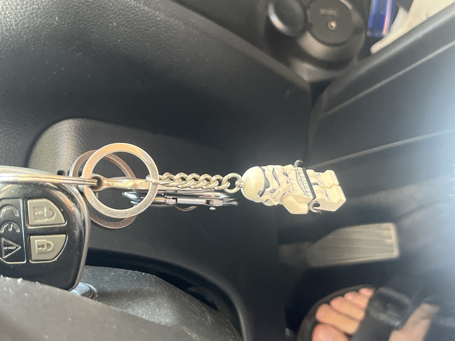 The image displays the interior of a vehicle, centered on a set of keys inserted into the ignition. A black car key fob featuring silver buttons with an exclamation mark, open lock, closed lock, and trunk symbols is attached to a large silver split ring. This ring also holds several smaller metal keys, additional split rings, and a metal carabiner-style clip. Suspended by a metal chain from the primary key ring is a light beige Lego-style Stormtrooper minifigure keychain. The surrounding vehicle interior components include a dark grey or black textured plastic dashboard or steering column area. A car pedal is partially visible in the lower-left background. On the right side of the frame, a circular compartment, consistent with a 12V power outlet or USB port, is open, revealing partial views of blue and white objects within. A human foot, wearing a black sandal, is partially visible in the lower-left corner. The scene is illuminated by ambient light. No identifiable features within the image indicate a specific location in Coatzacoalcos, Mexico.