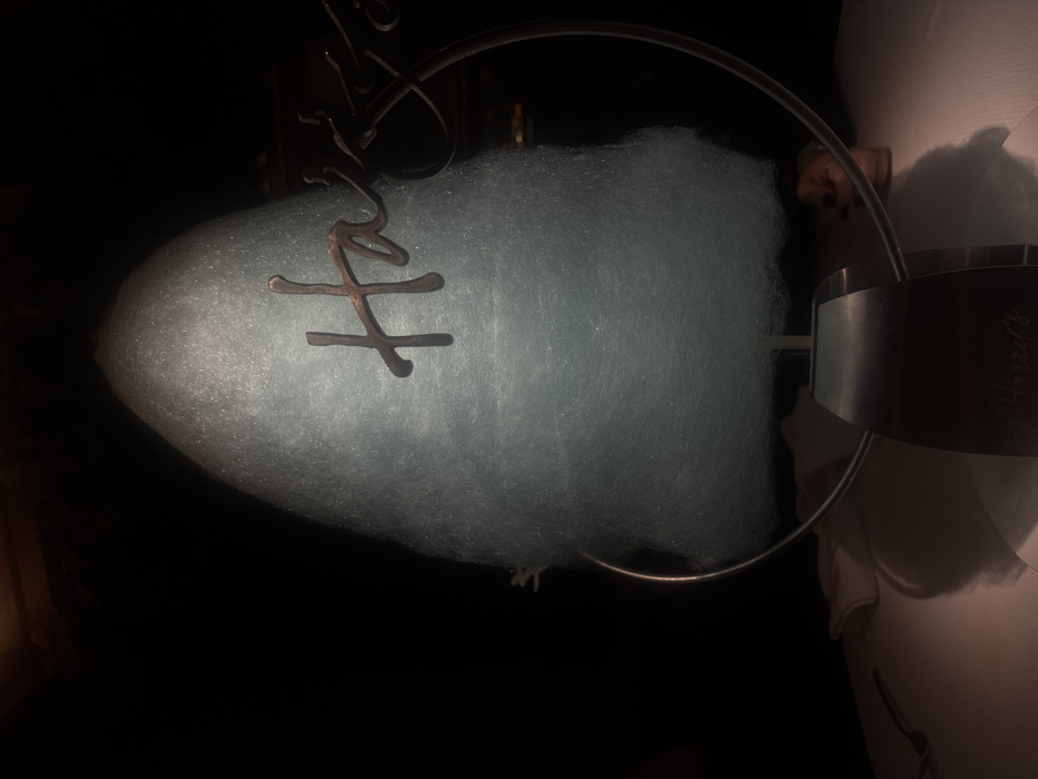 An upward-angled shot captures a large, conical mass of pale blue cotton candy prominently displayed on a table. The cotton candy is held by a metallic stand featuring a thin, circular frame that partially encircles the confection, and a brushed metal base. A script-style, bronze-toned metal logo spelling "Harry's" is affixed to the circular frame, positioned against the cotton candy. The same "Harry's" logo is faintly visible etched into the brushed metal base of the stand. The display rests on a white tablecloth. The overall environment is very dimly lit, creating a stark contrast with the illuminated cotton candy. The background is predominantly dark and indistinct, suggesting an interior setting like a restaurant. A vague, reddish-brown blur is discernible in the far right background, but no identifiable figures or objects are present. The scene is located within a Harry's restaurant, specifically the Harry's Steakhouse & Raw Bar in Polanco, Mexico City, Mexico.