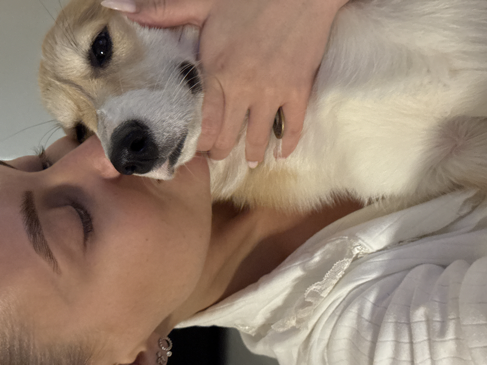 A woman is shown hugging a dog. The dog is primarily white with tan markings around its face and ears. The woman has fair skin, closed eyes, and dark eyebrows. She is wearing a white garment. The image is taken close up. There is no evidence in the image to suggest this was taken in Chaikovsky, Russia.
