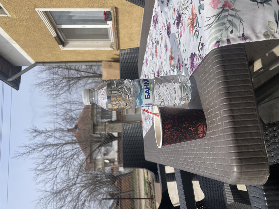 This image depicts an outdoor scene in Tarnava, Bulgaria, under clear skies. In the foreground, a dark brown, textured plastic outdoor table is visible. On the table, to the left, stands a reddish-brown and black paper coffee cup with a red stir stick inserted. The cup features graphic designs including text such as "COFFEE," "ATTITUDE," "HAPPINESS," and "TEA." To the right of the cup, a clear plastic bottle of Bankya mineral water, partially full, is positioned upright. A white and blue label with Cyrillic text, including "БАНКЯ," is visible on the bottle. A floral-patterned tablecloth or runner, predominantly white with purple, pink, and green botanical elements, covers the table surface to the right of the water bottle. Dark-colored outdoor chairs, possibly made of woven plastic, are partially visible around the table. In the midground and background, an open-air environment is present. To the right, a section of a two-story building with a stuccoed yellow facade and a white-framed window is visible. A dark vertical downspout runs along the building's corner, and a small red object rests on the windowsill. The left and central background feature several bare trees with fine branches, indicating late winter or early spring. Behind the trees, a residential house with a reddish-brown tiled roof and a light-colored exterior is discernible. A low fence or barrier traverses the midground. The ground appears unpaved or sparsely vegetated. The scene is illuminated by direct sunlight, casting distinct shadows. No people are present.