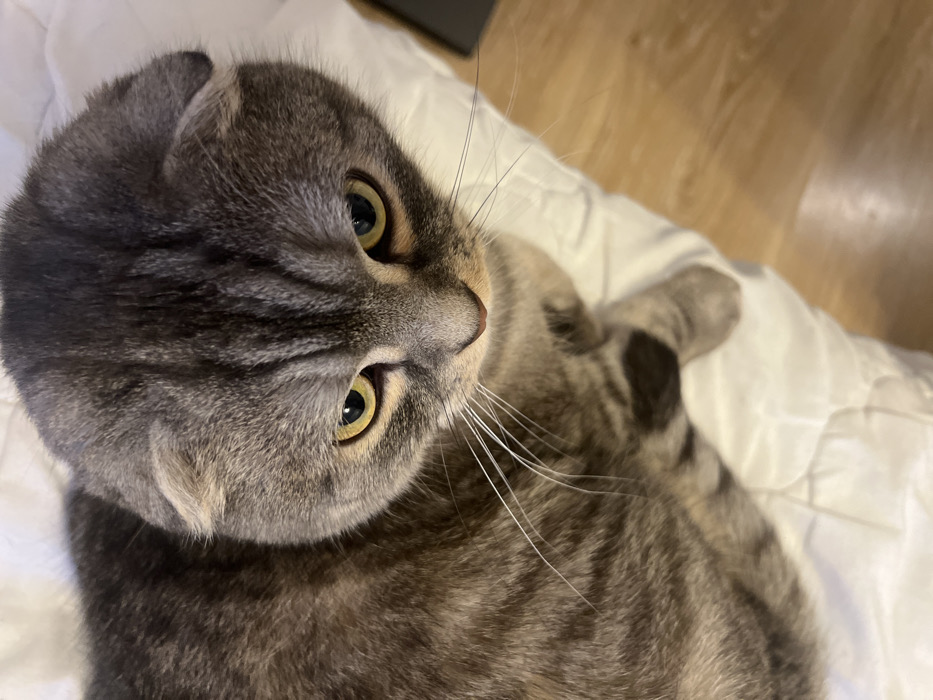- "An overhead photograph, taken in the city of Murino, Russia, depicts a gray tabby Scottish Fold cat in an indoor setting" by FM-6LnVy2, licensed under CC BY 4.0
