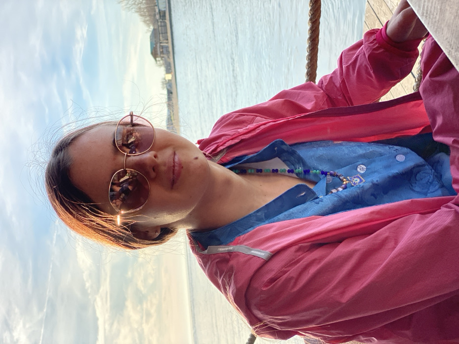 A woman in sunglasses and a pink jacket sits outdoors with water and a building in the background. She wears a blue shirt and a beaded necklace. Light reflects in her sunglasses, and she looks at the camera. Part of a rope swing or hammock is visible on the right side of the frame.