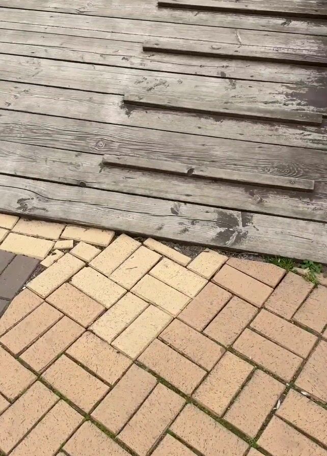 first-person perspective of someone walking across a wooden bridge with brick paving underneath and wooden buildings in the background under a cloudy sky. The person moves from the brick paving onto the wooden bridge, walking along the worn wooden planks with railing on either side. At the end of the bridge, there is a small town square with buildings and foliage visible.
