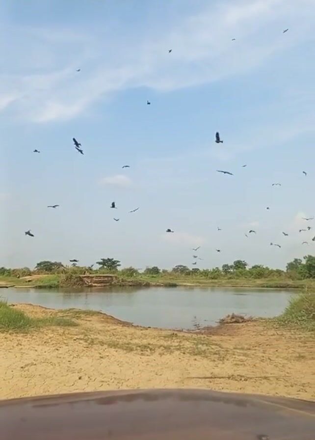 A car is stationary in front of a small body of water. A flock of black birds circles and flies over the pond, beneath a blue and cloudy sky. The foreground consists of sand and the car’s hood. Beyond the pond are trees and vegetation.