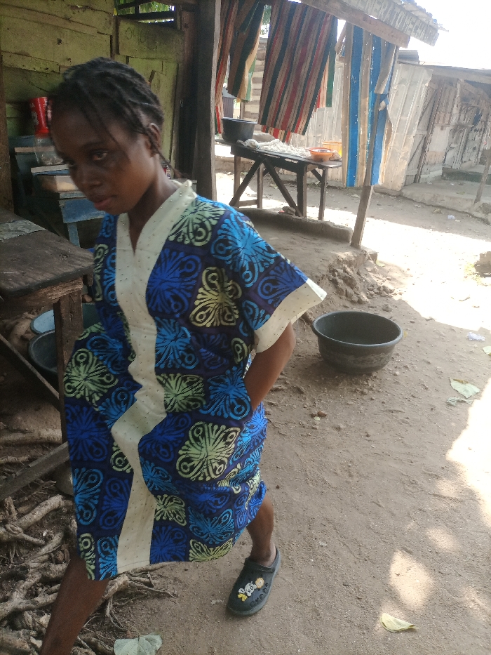 The image captures an outdoor scene in Adankolo, Nigeria, featuring a single individual and several rustic structures under bright daylight. In the foreground, a dark-skinned individual, appearing to be a young female, stands slightly angled to the viewer's left. She wears a loose-fitting, short-sleeved, patterned robe-style garment with a predominantly blue and dark blue design, incorporating lighter blue and yellowish-green motifs. A vertical cream-colored stripe runs down the front center, and the sleeves have cream-colored cuffs. Her hair is styled in dark braids. She wears black slip-on shoes, with the visible right shoe displaying a small, light-colored decorative emblem. Her gaze is directed slightly downwards and to her left. To the left of the individual, part of a weathered wooden table or bench is visible, with exposed tree roots on the dirt ground beneath it. To her right, a dark grey or black plastic basin rests on the dirt ground. The background features a collection of simple, rustic structures. Overhead, striped fabrics, one predominantly red and white, another blue and white, hang from wooden beams, possibly as awnings or displays. Further back, a wooden table holds a black bucket, two orange plastic bowls, and a quantity of white, possibly textile or food, material. The structures are composed of rough-hewn timber and corrugated metal, indicating utilitarian construction. The ground throughout the scene is uneven dirt, and strong shadows suggest overhead sunlight.